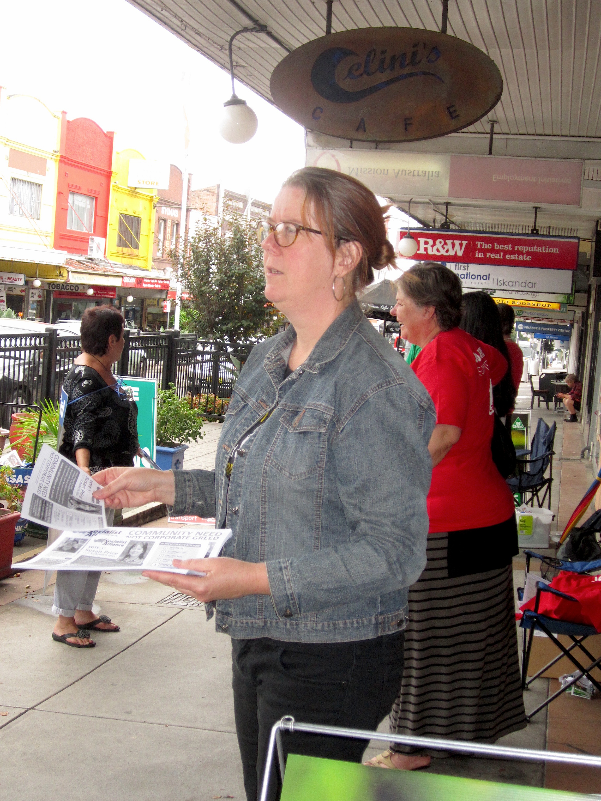 On Marrickville Road outside a pre-polling booth are representatives of The Greens, Labor and Liberal Parties and the Socialist Alliance candidates and volunteers.